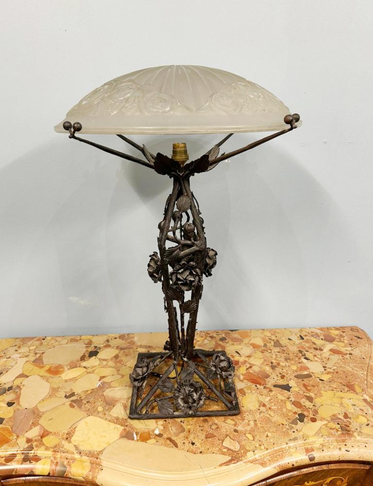 Stylish art deco French lamp with wroght iron base