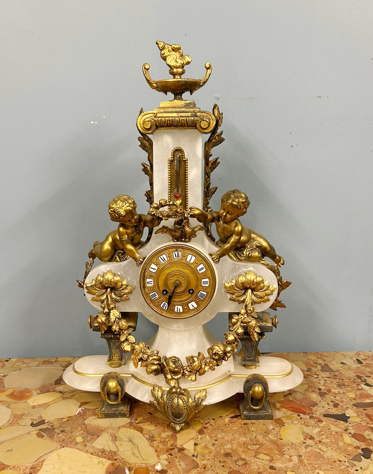 Crafted from alabaster marble with ormolu fixtures including the cherubs (putti)