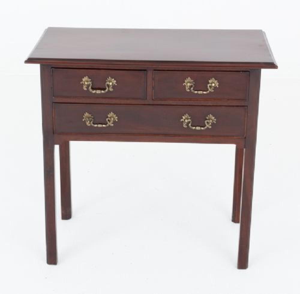 The low boy features an arrangement of 2 over 1 oak lined drawers (note the fine dovetails) with decorative cast brass swan neck handles