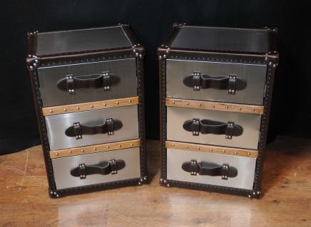 – Funky pair of industrial style bedside chests in metal and leather with wood trim