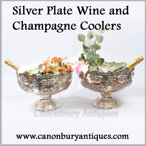 At Canonbury Antiques we carry a range of silver plate ice buckets and wine coolers – perfect for all your party hosting needs. Nothing adds elegence and style to a dinner party or champagne party like a classic silver plate wine cooler and we hope you can find a suitable one from our extensive selection. Many of them are Sheffield silver plate so are made with the classic electroplating technique as first pioneered in Sheffield, England in the 1800s.