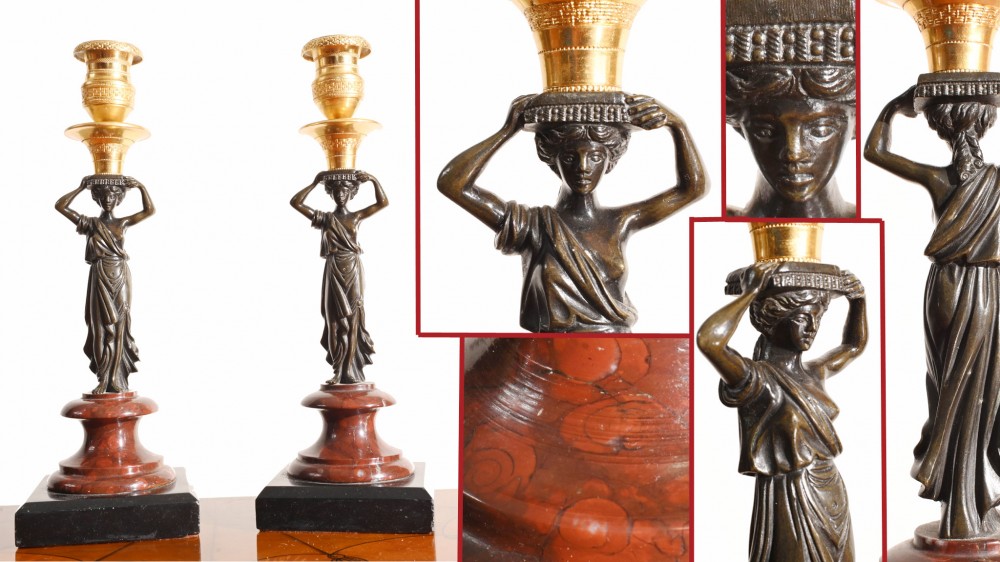 The toga clad maidens in bronze hold aloft the ormolu candle holders