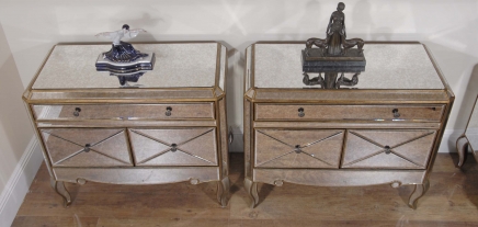 You are viewing a gorgeous pair of Italian mirrored bedside tables each one drawer and a large cupboard that opens out underneath so there is ample storage space. These are a delightful pair. Mirrored furniture is great for adding space and light to any room and these really fulfil that function.