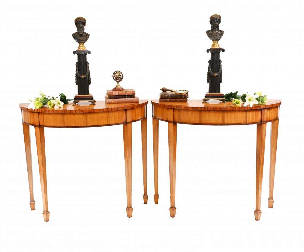 CLICK HERE TO BUY THIS PAIR REGENCY CONSOLE TABLES SATINWOOD DEMI LUNE HALL ON CANONBURY ANTIQUES