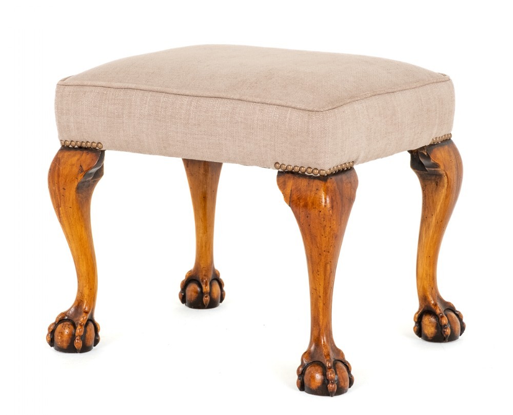 Walnut Queen Anne style stool. This replica Queen Anne stool stands upon cabriole legs with boldly carved ball and claw feet. The stool is of good quality and presented in good condition. Circa 1900.