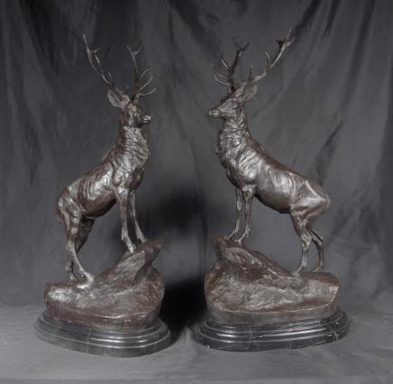 You are viewing an incredible pair of bronze Scottish stags. They are a perfect left and right and would be just the sort of creature you’d find at emerging from the mist in a glen. They are nearly seven feet tall. I hope the photos accurately convey the quality and beauty to the casting. Features like the texture to the main, and the finely detailed coat are particularly worthy of note.