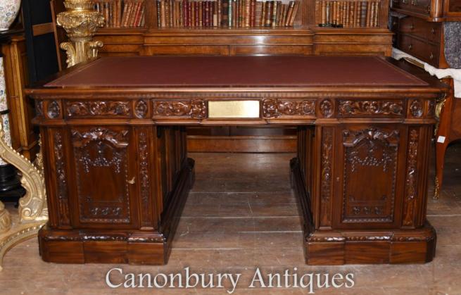 You are viewing a totally unique large Presidents Resolute desk hand carved from the finest mahogany. I hope the photos do this stunning work of art some justice, it is certainly better in the flesh. This is the same desk that the President has in the Oval Office in the White House.
