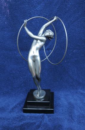 The piece we have here is an almost archetypal example of a the 1920s idealised female form and art deco aesethetic. The lithe female wears a figure hugging cress which fans out via her pleats. She holds her arms aloft to hold up the hoop and she has her head back seductively.