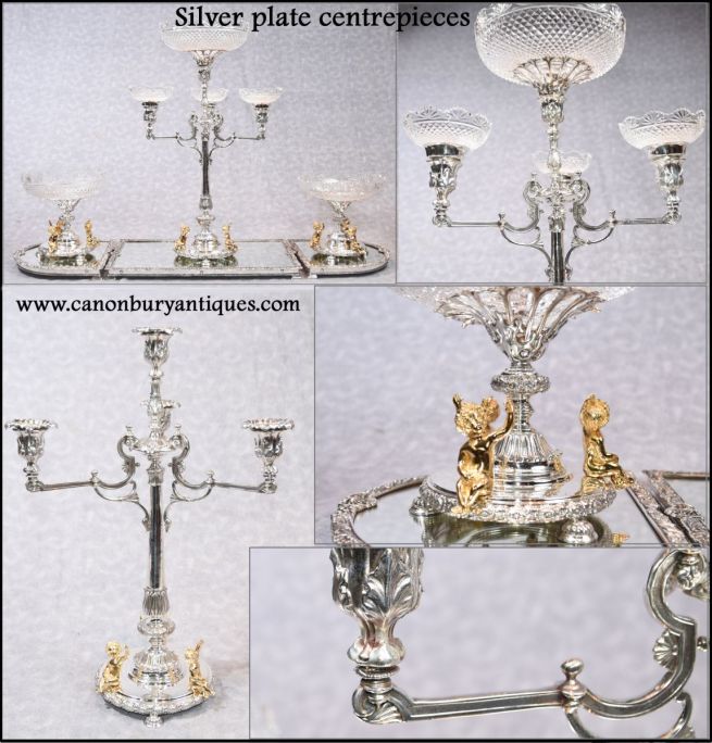 Some of larger silver plate centerpieces can measure ten feet (over two metres) across and compromise various glass dishes, trays, bowls, candelabras and trays. Some of the models can the central column can swap from either being a candelabra to a glass dish and support. Each different branch of the candelabra will be numbered to correspond to the correct size on the candelabras. They can be admired from all angles as often the glass tray base they stand on will be mirrored to reflect the gorgeous designs. They can be made in various styles including Rococo and Neo Classical, we even carry a few versions that have had characteristic camels on them.